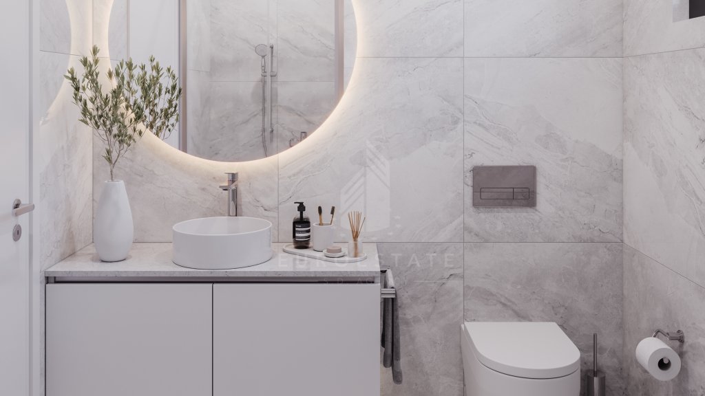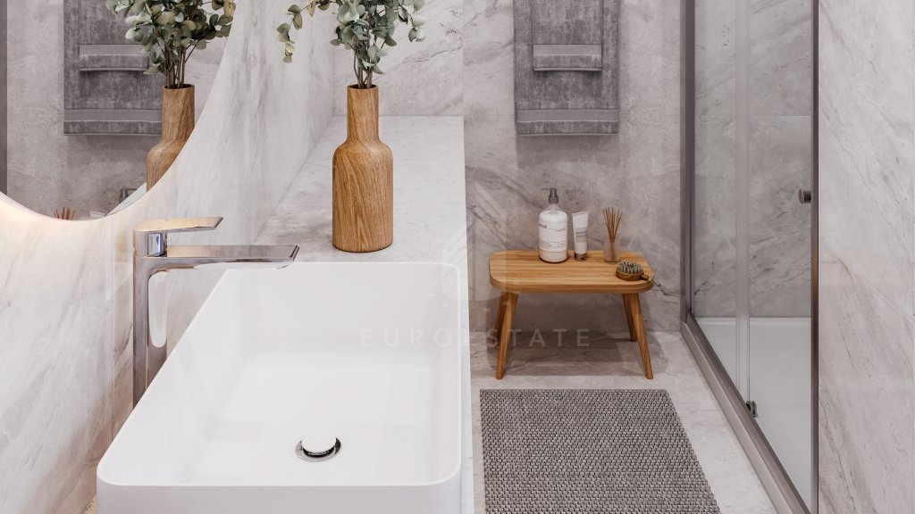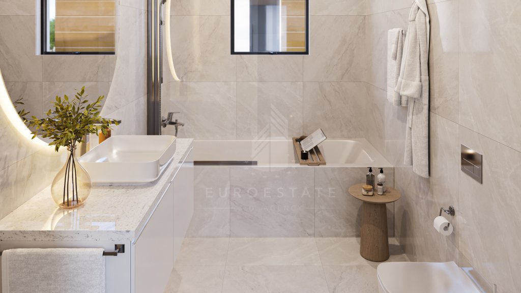 Outside, the property offers an optional private pool, patio, BBQ area, landscaped gardens, and local stone decoration. Sustainable features include solar panels for water heating, a water pressuring system, and provisions for PV plants.